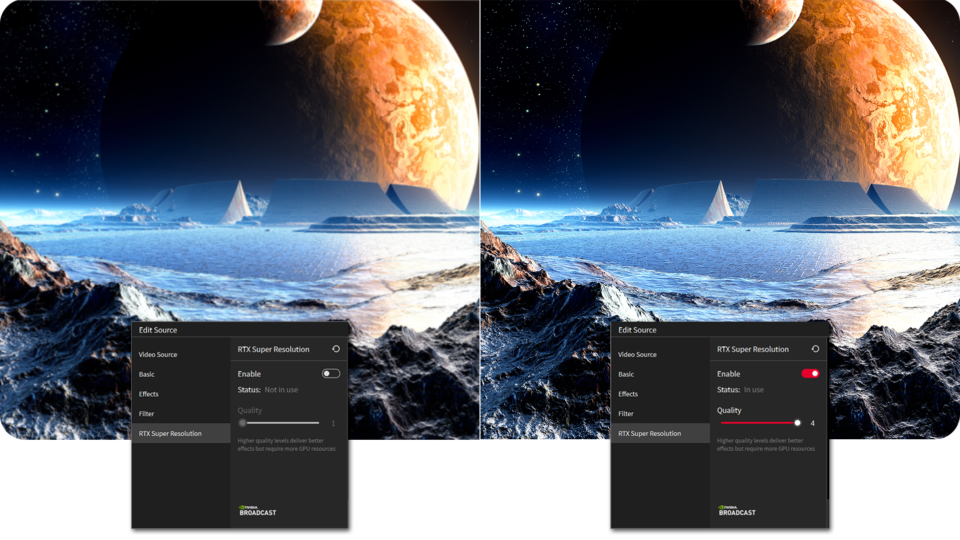 支持 NVIDIA RTX Video Super Resolution ,为您的内容带来AI升级。立即将旧的或低分辨率的镜头细化到接近4K的清晰度,提升高分辨率显示器观看体验。非常适合升级经典游戏录制、传统流媒体或任何值得提升视觉质量的内容。"
