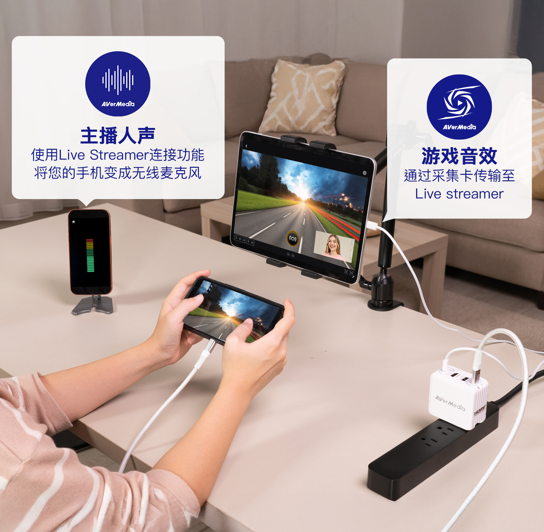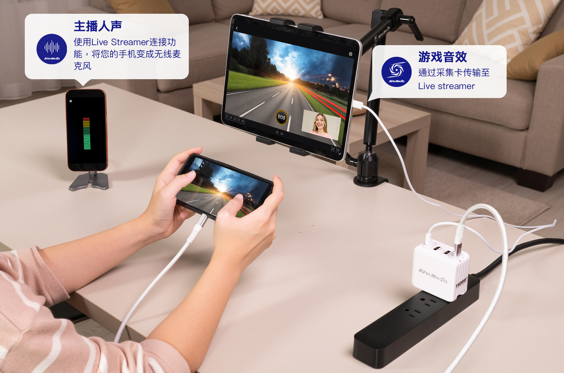 搭配GO系列采集器,平板即可化为外接游戏与内容的全屏显示器。使用Live Streamer应用程序后,它更将突破屏幕限制——无需电脑,直接通过移动设备*实现录制与直播。